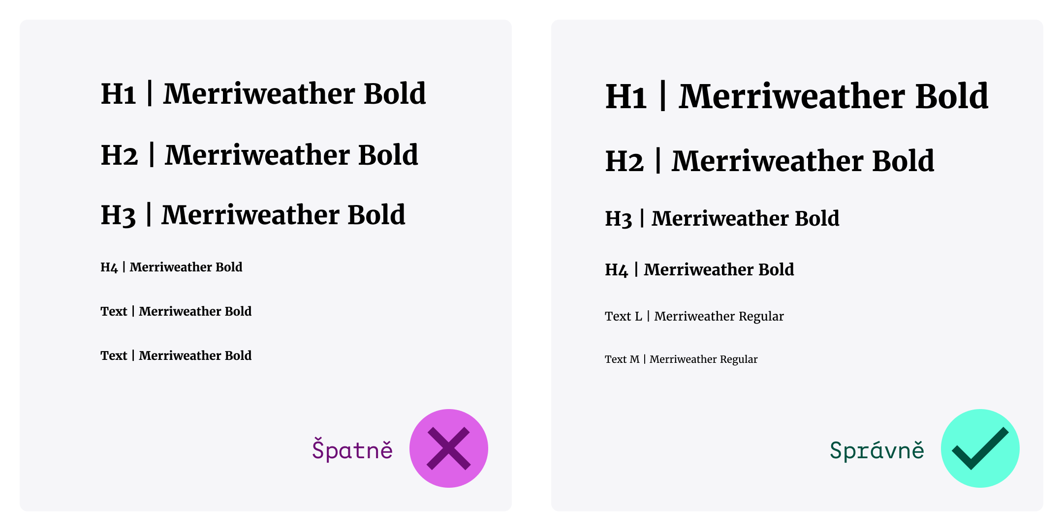 ❌ Nadpisy i odstavce stejnou velikostí bez rozlišení.