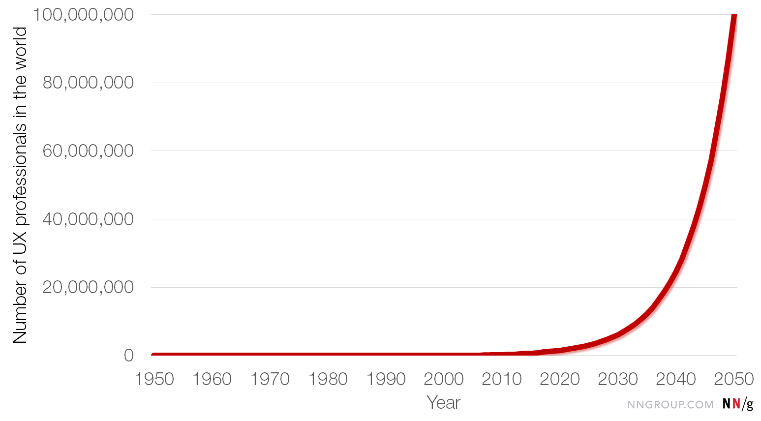 Připomíná mi to štědrodenní článek Jakoba Nielsena z roku 2017, kde se pokoušel o výhled UX na sto let. Do článku vložil dnes už legendární graf vývoje počtu UX specialistů pro roky 1950—2050. Z grafu je patrné, že od teď za čtvrt století by na světě mělo být sto milionů UXerů. Je to samozřejmě nesmysl a datum vydání napovídá, jak moc vážně máme článek brát.