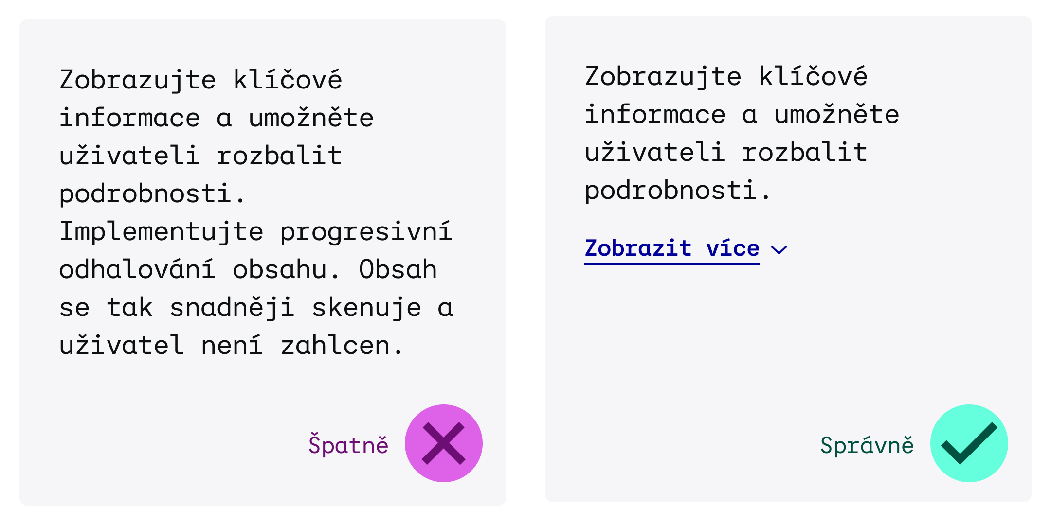 Implementujte progresivní odhalování obsahu. Zobrazujte klíčové informace a umožněte uživateli rozbalit podrobnosti.