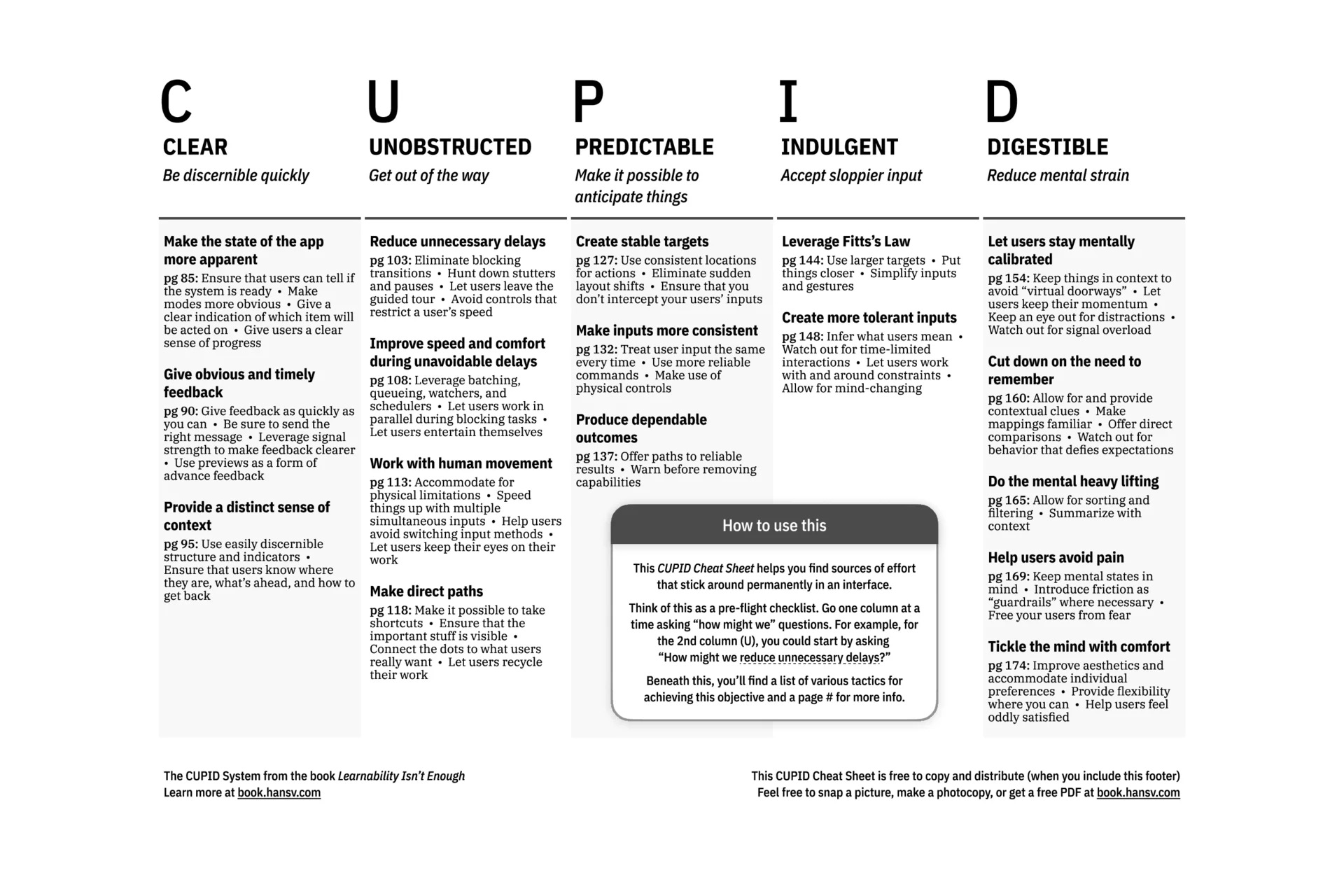 CUPID je framework pro návrh uživatelských rozhraní, který vytvořil Hans van de Bruggen. Pomáhá designérům odhalovat a odstraňovat trvalé zdroje tření, které uživatelé zažívají při každodenním používání aplikací. Na rozdíl od běžných heuristik, které se zaměřují hlavně na naučitelnost, řeší CUPID to, co zůstává obtížné i poté, co uživatel systém ovládá.