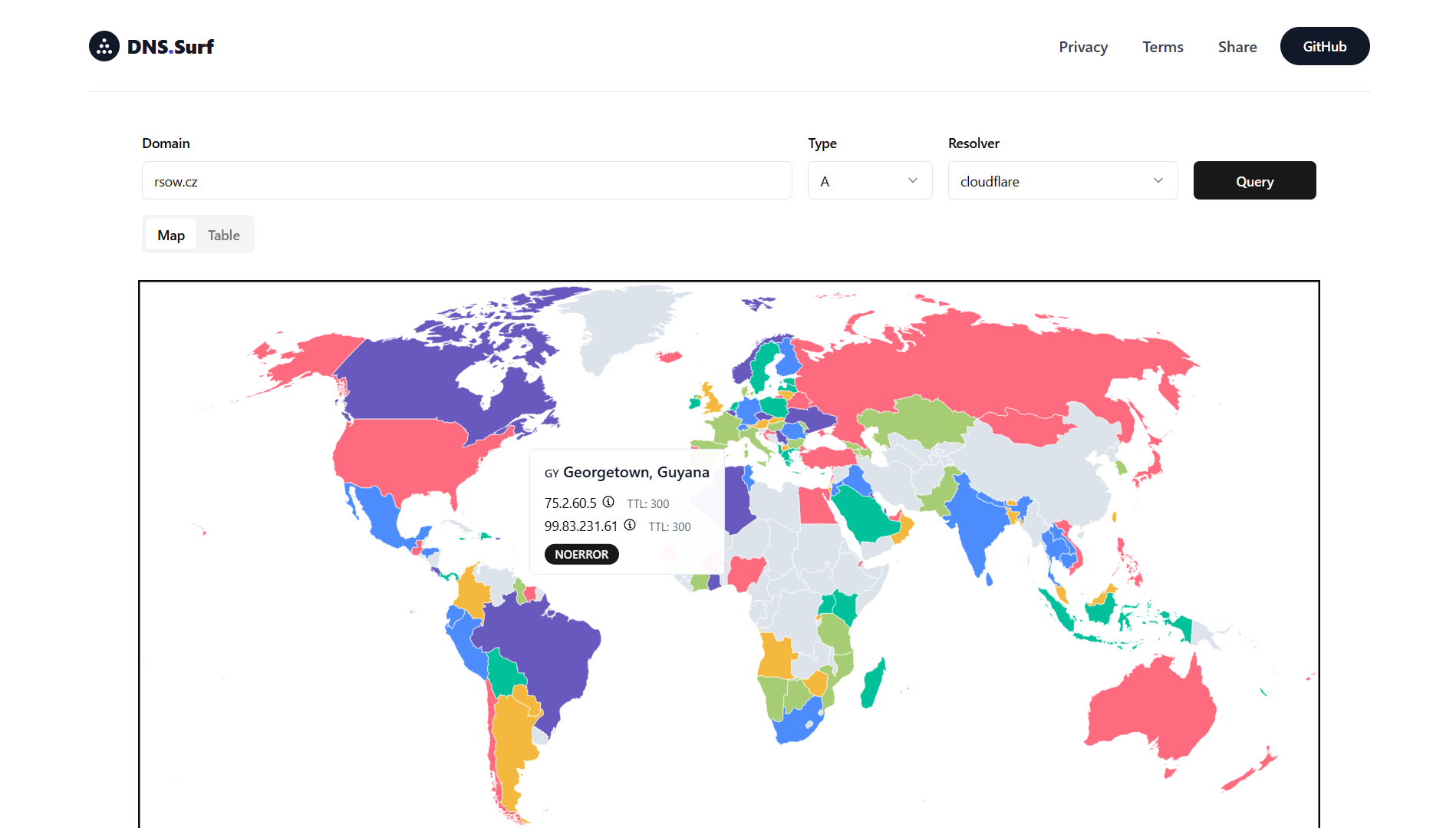 DNS.Surf je online nástroj, který umožňuje sledovat, jak DNS servery po celém světě odpovídají na dotazy k vaší doméně.