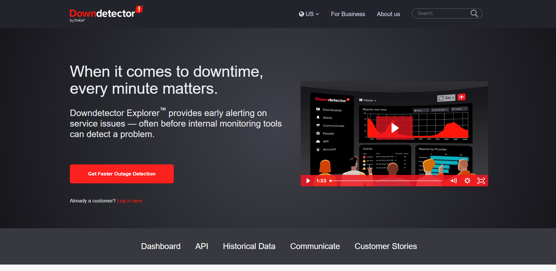 Firemní varianta umožňuje upozornění v reálném čase, nabízí API nebo RSS pro napojení na interní systémy a přehledy s grafy nárůstu uživatelských stížností. Slouží tak jako pohled zvenčí: pokud si najednou mnoho zákazníků stěžuje na pomalé načítání nebo nefunkční přihlášení, DownDetector vyhodnotí, že může jít o incident.