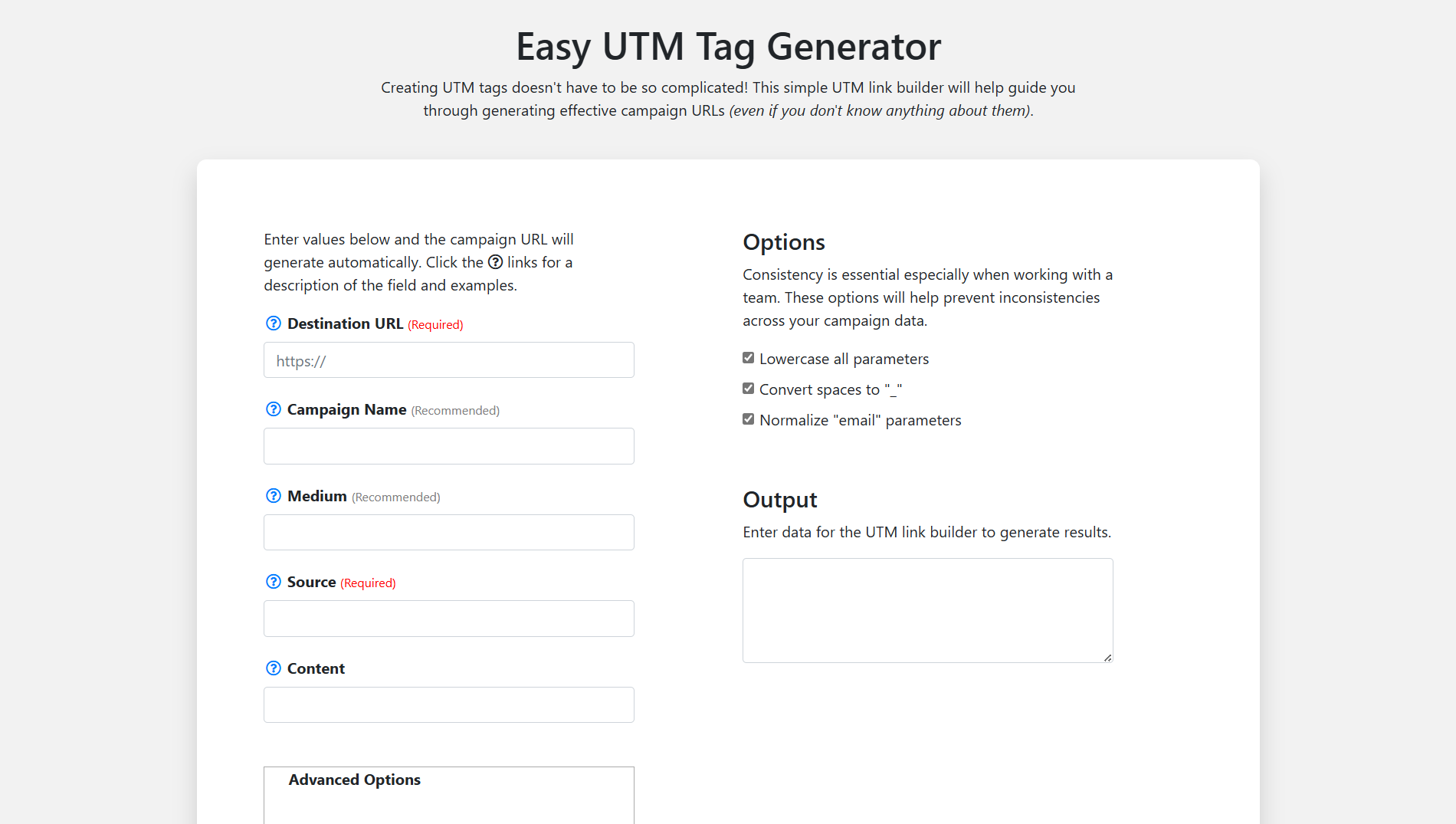 Nástroj usnadňuje práci tím, že ke každému poli poskytuje vysvětlení a příklady. Povinná pole, jako je cílová adresa nebo zdroj návštěvnosti, jsou jasně označena. Volitelně můžete doplnit další parametry, jako je obsah, hledané výrazy nebo nové značky pro GA4 – například utm_id