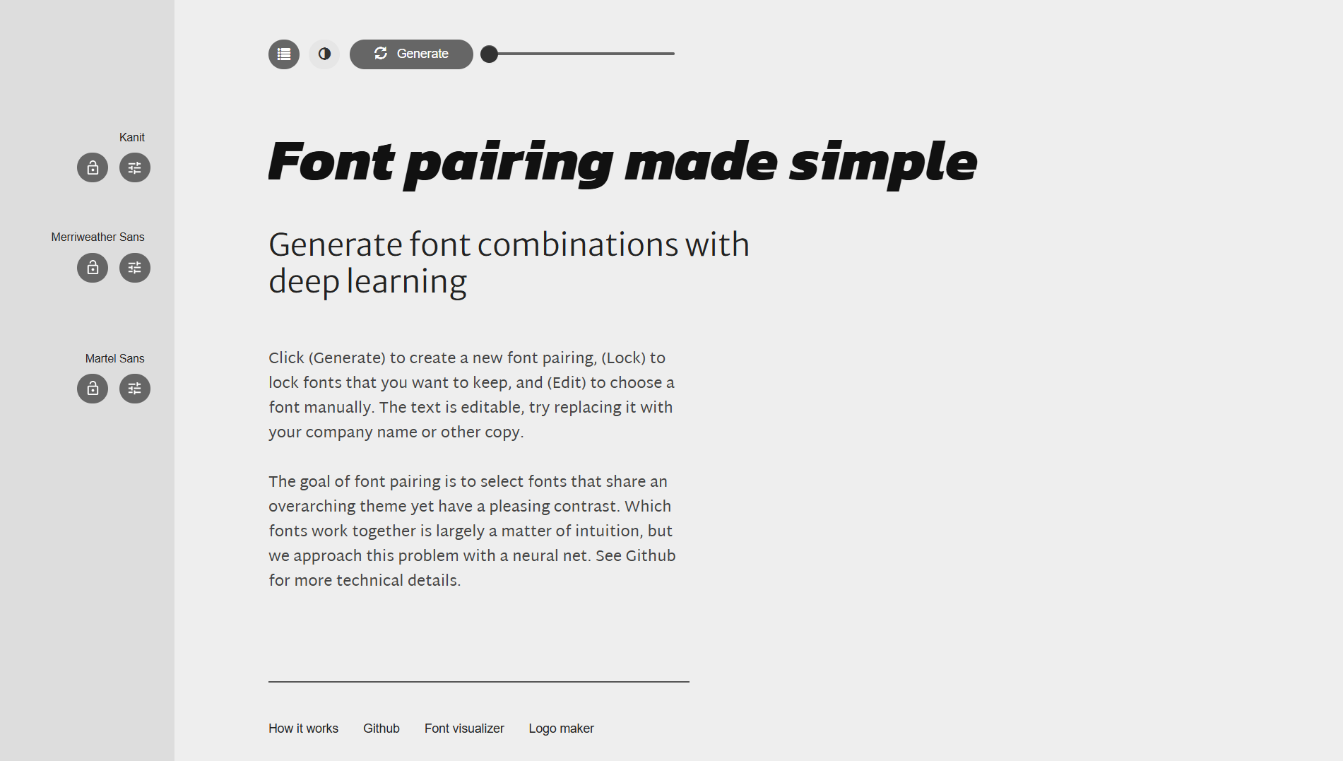 Fontjoy.com je nástroj, který využívá umělou inteligenci k nalezení kombinací písem. Pomocí strojového učení analyzuje vlastnosti písem a navrhuje párování, které vyvažuje mezi kontrastem a soudržností. Můžete si vygenerovat automatické návrhy, uzamknout konkrétní písmo, manuálně vybrat alternativy a přizpůsobit slepý text pro realistický náhled. Pomocí táhla si sami určíte, zda chcete, aby písma spíše ladila nebo kontrastovala.