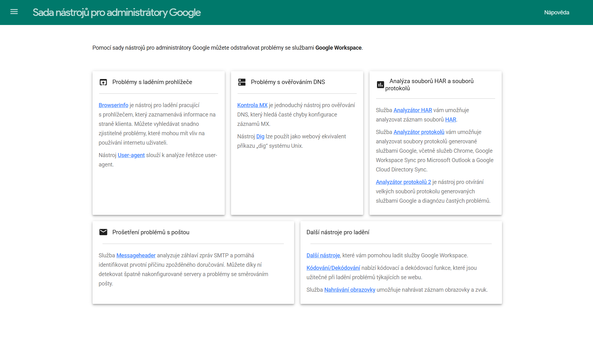 Google Admin Toolbox – webová sada nástrojů pro testování, diagnostiku a řešení problémů s doménami a službami Google Workspace.