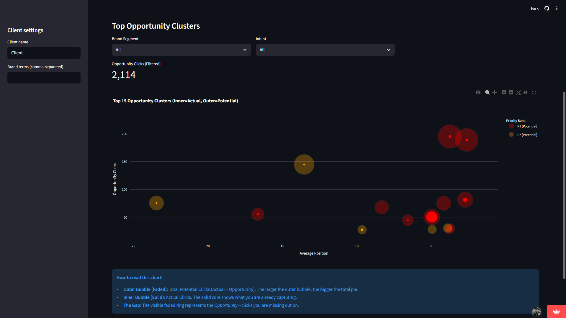 Princip je jednoduchý. Nahrajete CSV soubor s dotazy a CSV soubor se stránkami z přehledu Výkon → Výsledky vyhledávání. Aplikace pak data přeuspořádá do pohledů, které dávají smysl i mimo SEO nástroje: stránky s nejvyšším růstovým potenciálem, tematické shluky místo jednotlivých klíčových slov, rozdělení podle záměru vyhledávání a mapování témat na konkrétní URL. Zvláštní pozornost si zaslouží i upozornění na situace, kdy si více stránek konkuruje na stejné téma.