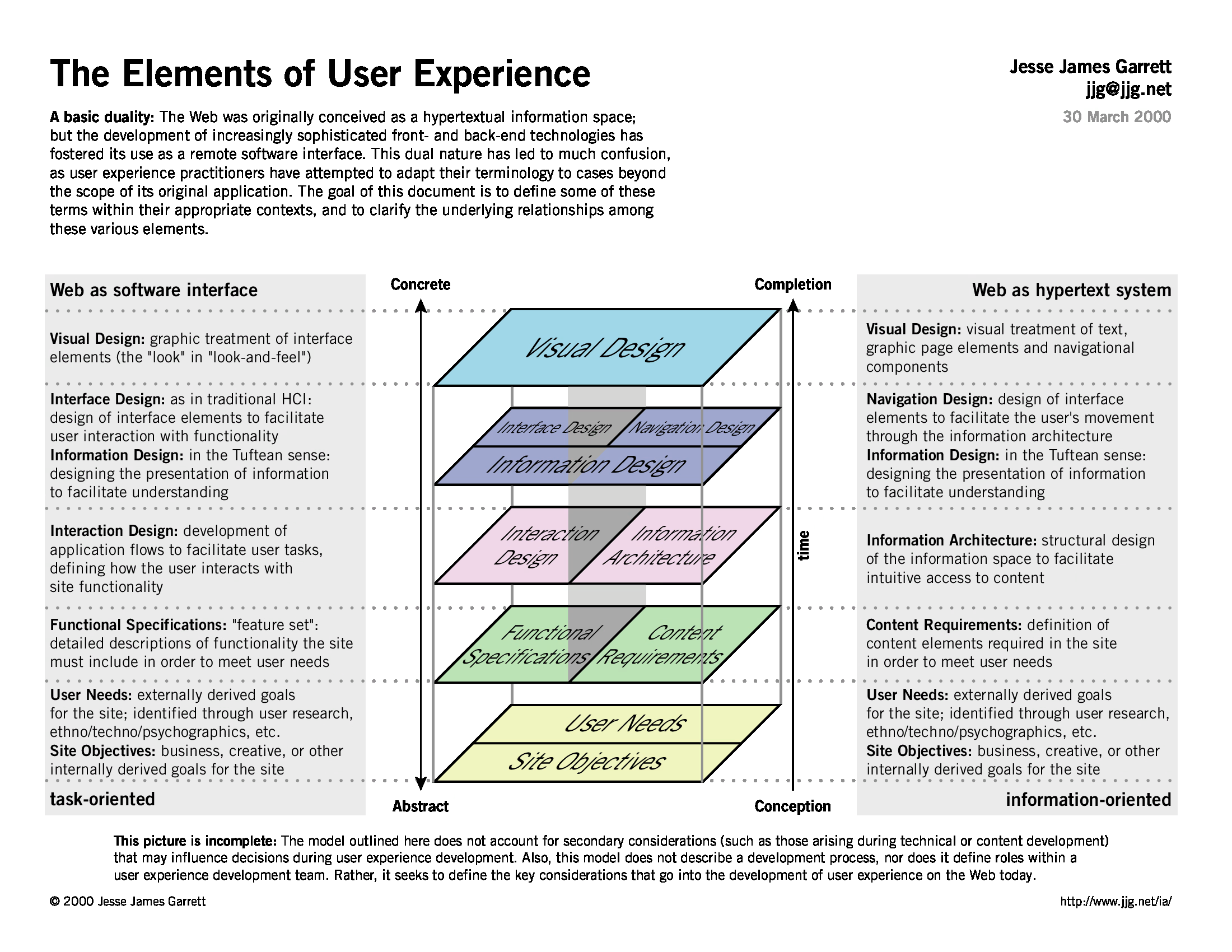 O několik let dříve se Jesse zapsal do historie jiným způsobem. V roce 2000 zveřejnil diagram pěti rovin UX: strategie, rozsah, struktura, kostra a povrch. Tento model později rozvinul v knize The Elements of User Experience z roku 2002. Díky němu mohli designéři propojit obchodní cíle s konkrétními detaily rozhraní. Model se stal základním kamenem výuky UX po celém světě.