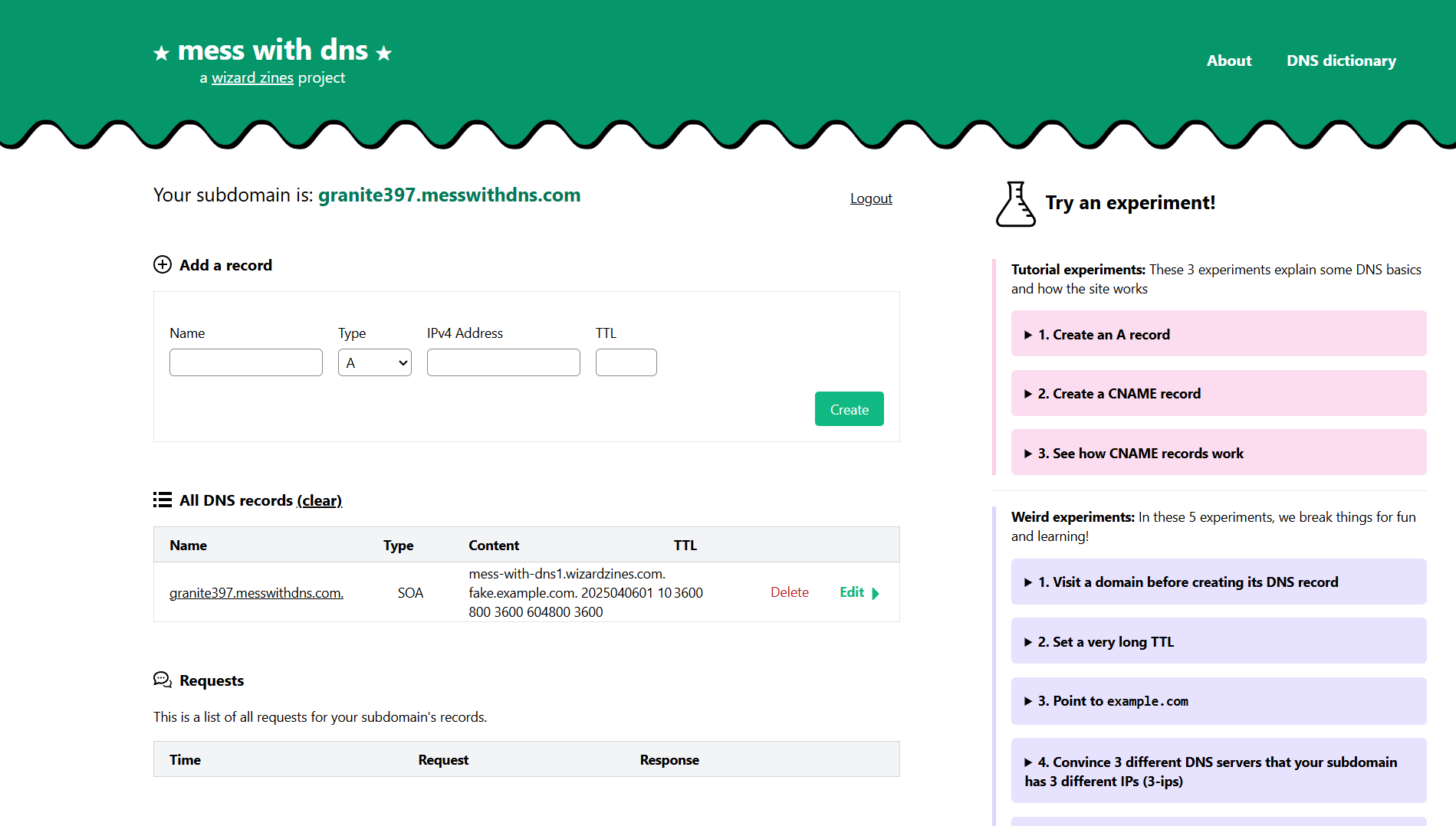 Mess With DNS je experimentální hřiště pro doménové záznamy. Umožňuje vyzkoušet si práci s DNS záznamy bez rizika pro vlastní doménu.