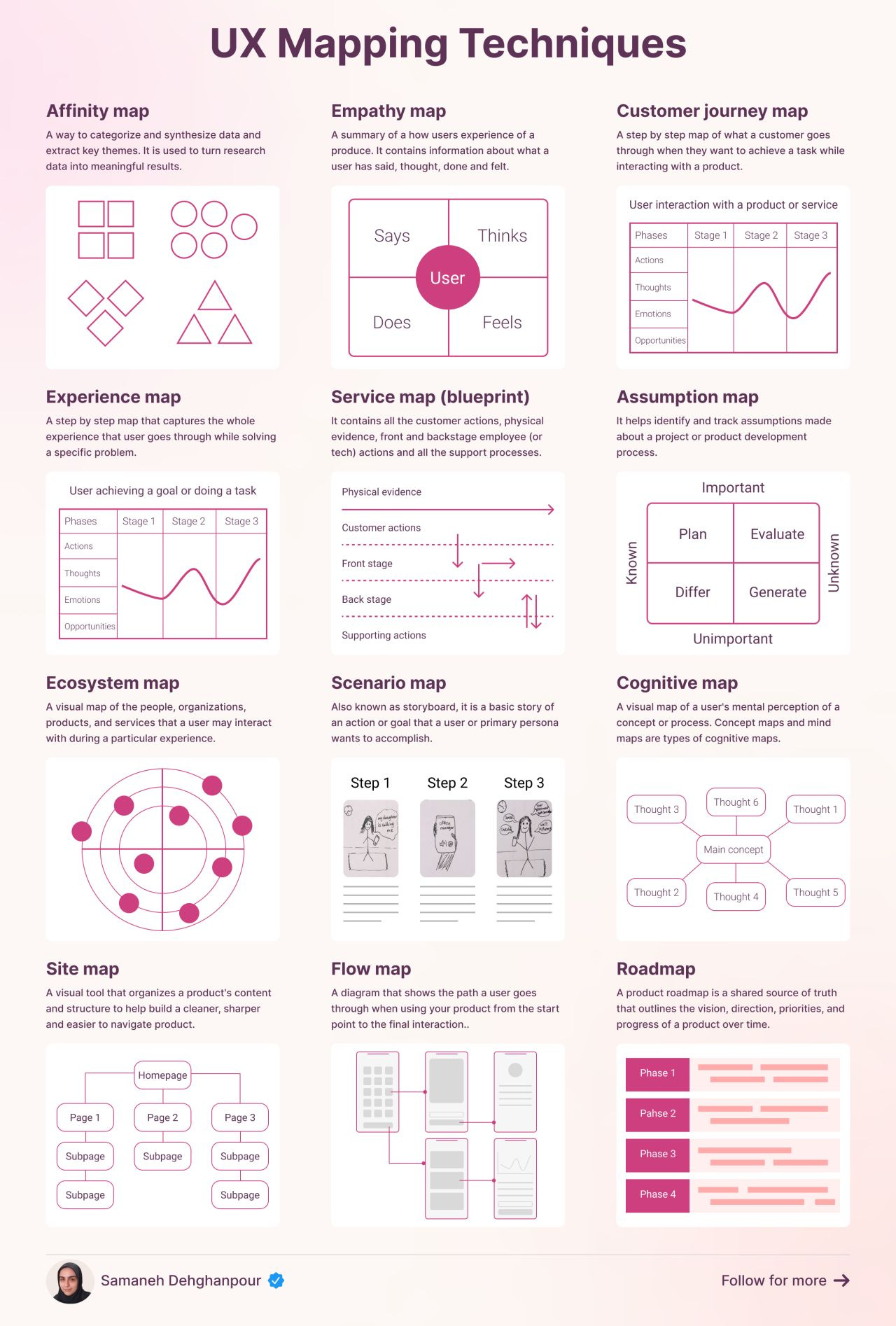 K technikám mapování se vrací také Anna Vasyukova ve článku An overview of mapping techniques used in UX Design Process nebo Aaron Christopher ve článku 16 UX mapping techniques to improve your Product development process. Pokud už jste toho o technikách mapování v UX načetli dost, pověste si vedle monitoru tahák mapovacích technik v UX od Samaneh Dehghanpour.