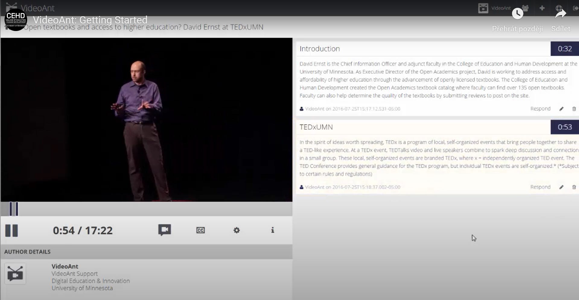 VideoAnt je webová platforma pro vkládání komentářů do videa, kterou vytvořila Pedagogická fakulta Minnesotské univerzity. Umožňuje přidávat komentáře přímo do videí zveřejněných na webu. Každý komentář, takzvaný „Ant“ (mravenec), je navázaný na konkrétní čas ve videu a umožňuje vést přehlednou diskusi. Tyto poznámky můžete exportovat, vkládat do jiných webů nebo sdílet s konkrétními lidmi, což se hodí pro výuku, vývoj produktů i uživatelský výzkum.